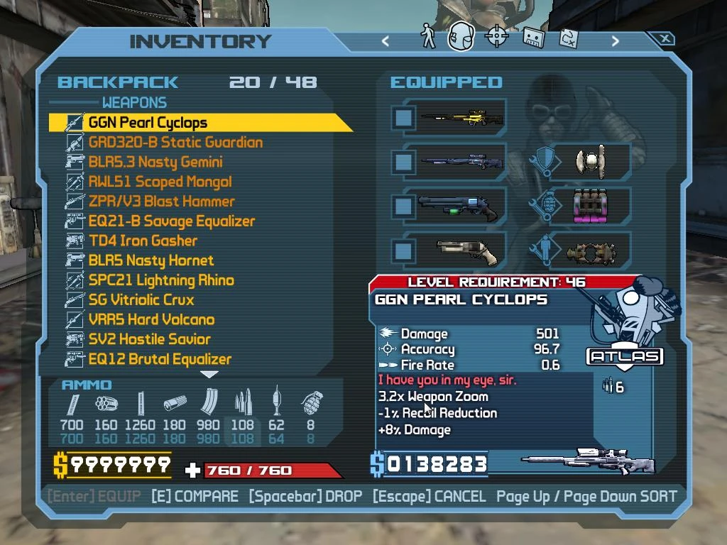 And that backpack interface? No stutters at all, and much much less clunky to work with than BL2ās. All your information on the same screen. Also, by the end of one playthrough you have about 42 backpack slots. No flash, all substance.